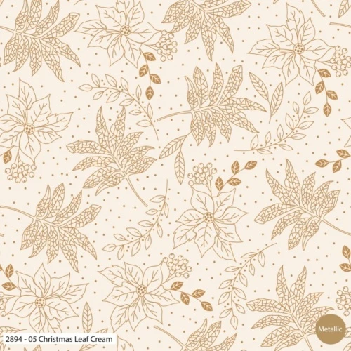 A cream christmas fabric showing gold metallic poinsettias