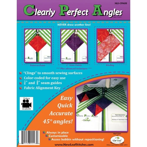 Never draw another line! The template clings to smooth sewing surfaces so it is always in position, ready to sew any 45degree angle accurately. Use to make half-square triangles, flying geese, snow balls, miters, and binding. Includes 1/4in and 5/8in seam guides. Customizable to any sewing set-up. Used and loved world-wide. No one likes drawing lines so this is the perfect add-on sale at your counter.