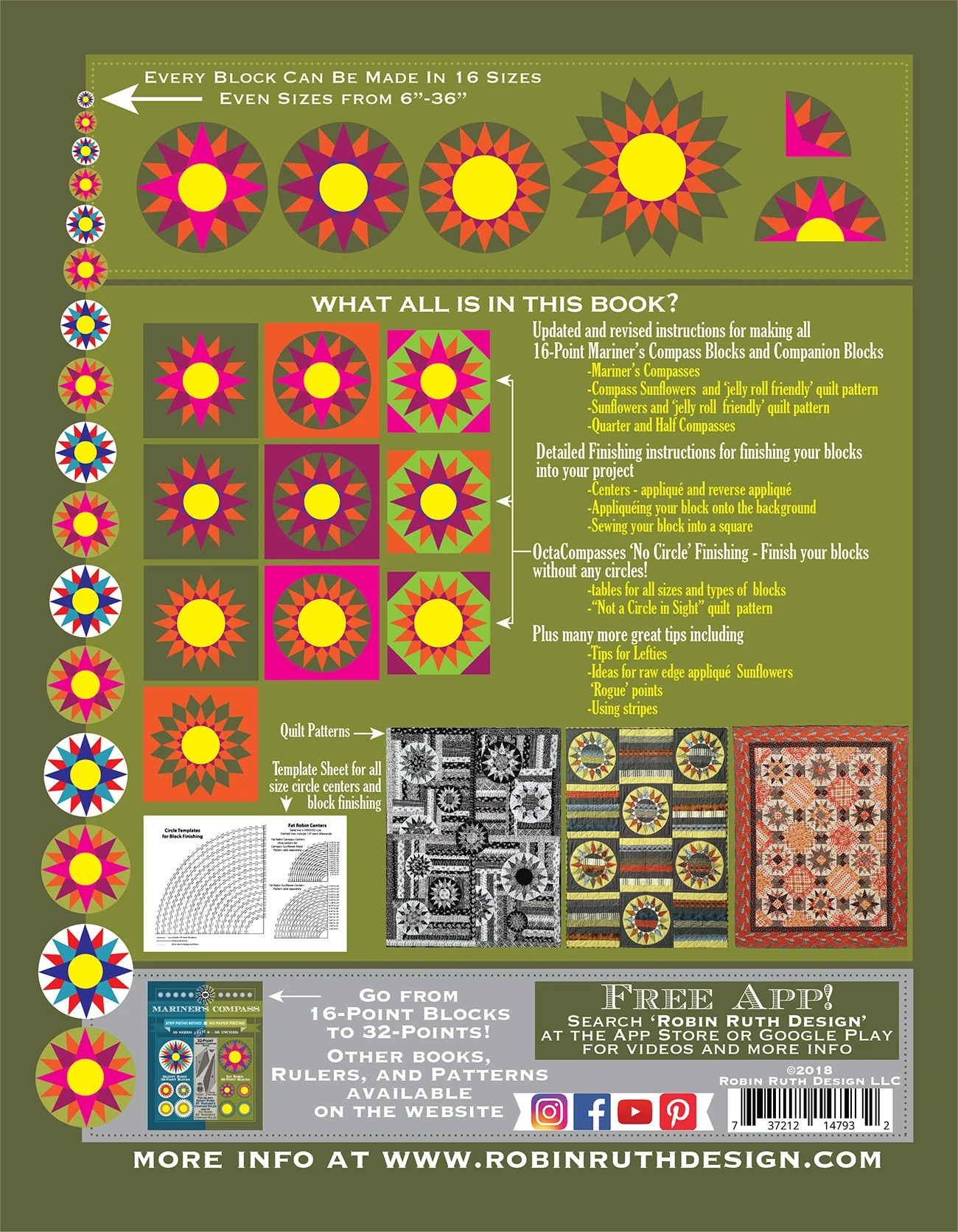 Revised and Updated. This set includes the original mariner’s compass book and ruler combo, plus the companion booklet, OctaCompass info and so much more! Strip Piecing method with no paper piecing. Sixteen sizes from 6in to 36in.