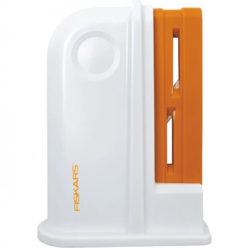 Our Desktop Scissors Sharpener makes it easy to keep all your scissors sharp for clean cuts. Simply insert a scissors with the Fiskars logo facing you and apply gentle pressure to the blades as you pull the scissors toward you. Usually, four strokes are enough to smooth worn blades, returning them to a sharp edge.