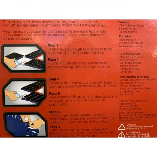 Contains two polyester fleece panels which are cut and tied together to create a No-Sew Throw blanket.
