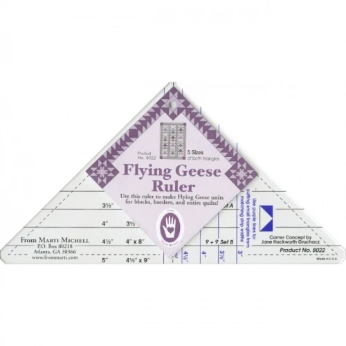 This ruler was made in response to customer requests for a bigger triangle. Now you can cut both triangles for Flying Geese units in 5 sizes with our special engineered corners. 2.5in x 5in, 3in x 6in, 3.5in x 7in, 4in x 8in and 4.5in x 9in.