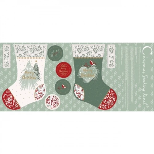 Christmas stockings featuring christmas trees and robins, decorated with holly and mistletoe