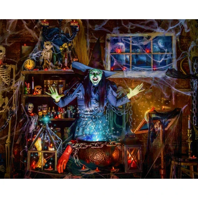 A halloween fabric panel featuring a scary looking witch brewing a potion in her cauldron