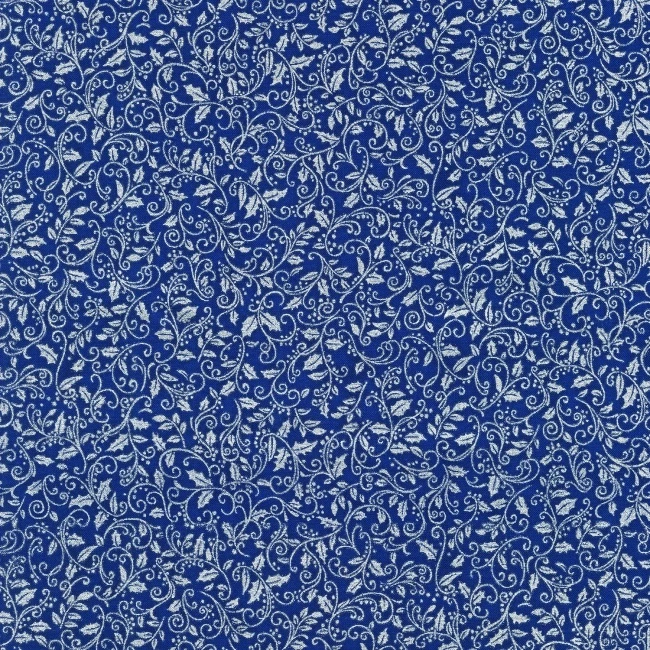 A metallic silver holly pattern on a royal blue fabric