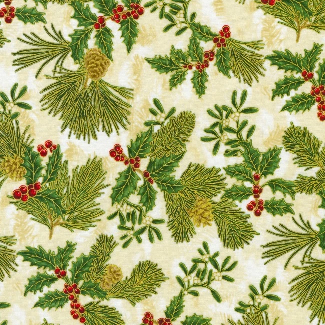Holly with red berries and pinecones on an ivory fabric, with metallic decoration
