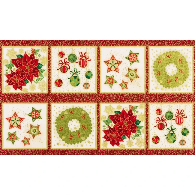 A christmas fabric panel featuring ornaments, wreaths, stars and poinsettias on a ivory and red fabric with metallic gold decoration