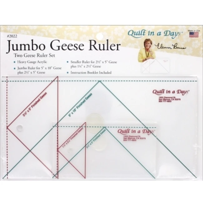 Set includes one jumbo ruler for 5in x 10in geese plus 2-1/2in x 5in geese; one smaller ruler for 2-1/2in x 5in geese plus 1-1/4in x 2-1/2in geese; and an instruction booklet with step-by-step directions.