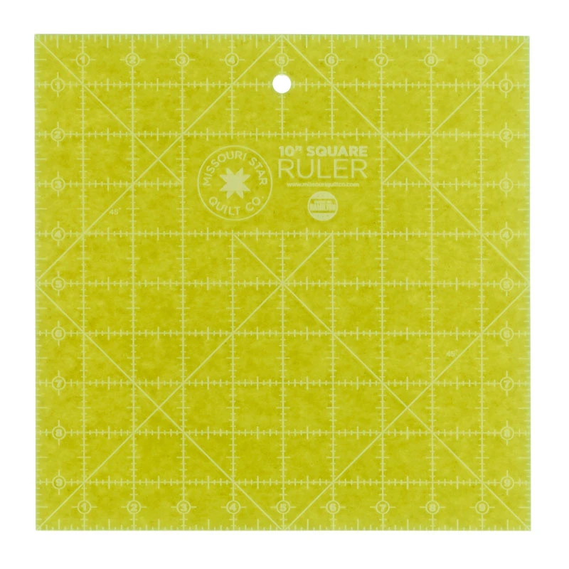 This versatile acrylic ruler makes cutting easy! Great for cutting yardage, strips, and 10″ squares. Has inch, half-inch and quarter-inch markings and a hole for hanging.