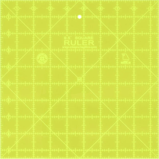 This versatile acrylic ruler makes cutting easy! Great for cutting yardage, strips, and squares. Has inch, half-inch, and quarter-inch markings and a hole for hanging. Missouri Star 9.5″ x 9.5″ Square Ruler