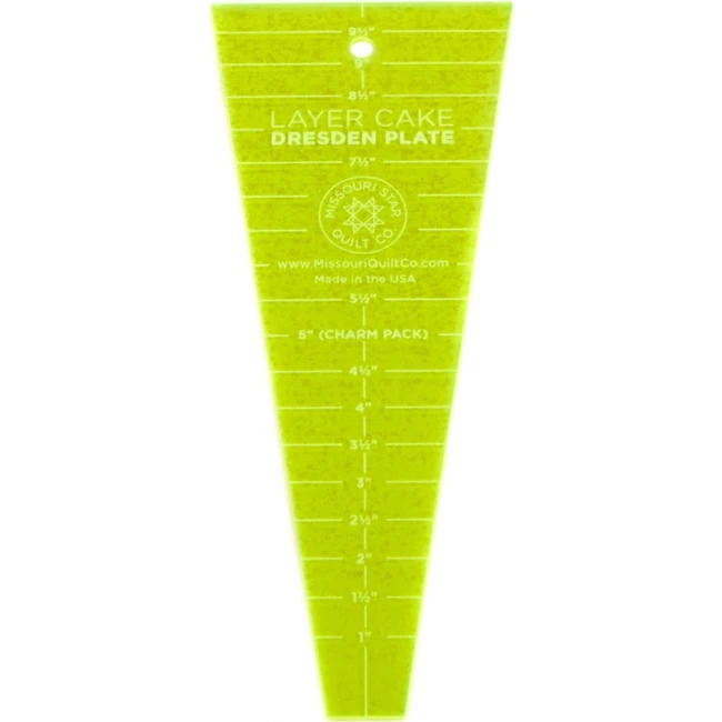 The Layer Cake Dresden Plate Template or Ruler from MSQC is a bigger version of the popular dresden template. This is helpful if you are using Layer Cakes for your projects. The template includes markings for Layer Cakes and Charm Packs. 10 in.
