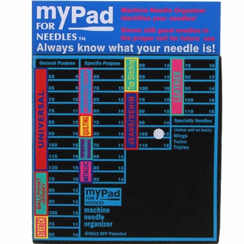 Don’t throw away a perfectly good unidentified sewing machine needle again! MyPad for Needlesª has brightly colored cells designating needle types and sizes to keep track of your slightly used needles until the next sewing project. Simply slip the needle into the appropriate cell on this super thick felt pad and you have it marked for the next time. There is also a flower pin to designate the needle that you are currently using in your machine. Almost every needle type is represented and there is ample space for you to designate unusual needles yourself with cloth and pen marker. You will love the way this product combines function with pleasing design. At last, the answer to our needle frustrations! Size: 6.75″ x 6.75″.