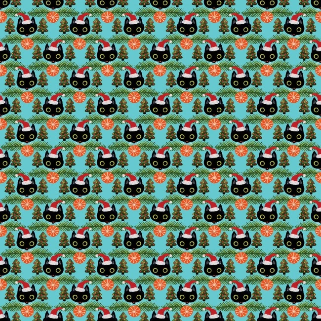 A blue fabric featuring cats wearing santa hats and christmas trees