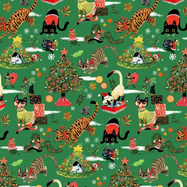 A green fabric featuring cats causing havoc amoung the presents and christmas tree