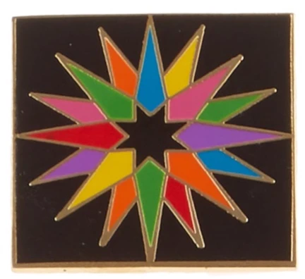 Pin Peddlers Mariner’s Compass block in rainbow colours on back pin. Pin is gold plated, hand enameled, with post and military clutch on back.
