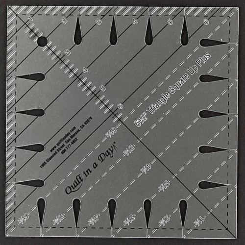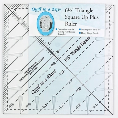 6 1/2 Triangle Square Up PLUS by Quilt in a Day This New and improved Triangle Square Up Ruler makes perfect half triangle squares or quarter triangle squares in half the time. Features tip grooves to trim tips at 1″ & 1/2″ increments. Squares patches up to 6 1/2 inch. The ruler is marked in two colorus for easy reading and coordinates with the most popular ruler brand. Convenient 1/8 inch, 1/4 inch, 1/2 inch and 1 inch lines for precise measuring. Laser cut and printed on Polycarbonate Clear Plastic. Fully illustrated and detailed instructions are included. Made in the USA