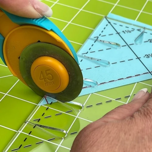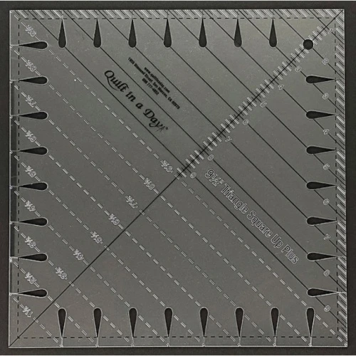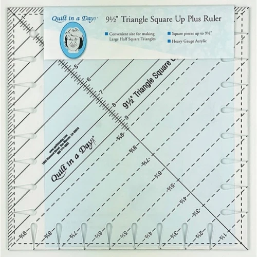 9 1/2 Triangle Square Up PLUS by Quilt in a Day This New and improved Triangle Square Up Ruler makes perfect half triangle squares or quarter triangle squares in half the time. Features tip grooves to trim tips at 1″ & 1/2″ increments. Squares patches up to 9 1/2 inch. The ruler is marked in two colours for easy reading and coordinates with the most popular ruler brand. Convenient 1/8 inch, 1/4 inch, 1/2 inch and 1 inch lines for precise measuring. Laser cut and printed on Polycarbonate Clear Plastic. Fully illustrated and detailed instructions are included. Made in the USA.