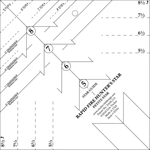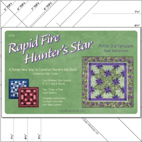 The Rapid Fire© Hunter’s Star tool and technique allow for streamlined construction and precision trim down and thus results in ease and accuracy when making these traditionally difficult blocks. There are multiple sizes on each tool, clearly illustrated step by step instructions, design layout options, and a “basic recipe” included to get quilters started on their first set of 16 blocks. The “basic recipe” has over 40 layout variations which can be seen in our Basic Recipe Razzle Dazzle photo gallery. This allows quilters to customize their projects right from the beginning so that each person can achieve that individualized look they so desire.
