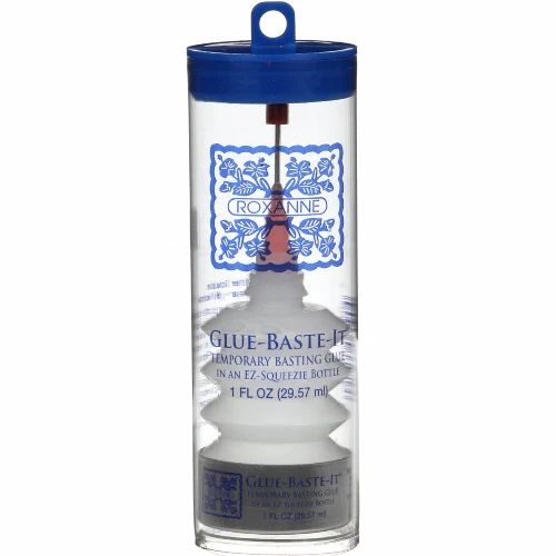 Roxanne ‘s Glue-Baste-It is 100% water soluble, dries in minutes, and the unique applicator top allows for controlled placement of tiny glue droplets. Does not feel stiff, and does not contain harmful chemicals, dyes, or waxes. It cleans up with water and washes out of fabric with soapy water, even after ironing or sewing. Great for scrapbooking, applique work, quilt binding, chenille strips – use anywhere you would normally use pins. Acid-free, non-toxic and safe for children. Contains no dyes or waxes or harmful chemicals and is pH neutral. Temporary 1oz- Comes in an EZ-Squeezie bottle with a needlenose tip for placement control.Â
