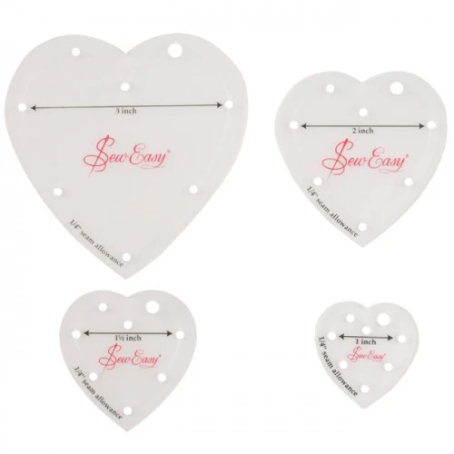 These mini heart template sets make cutting a variety of popular sizes of quilting shapes quick and easy. Completely clear and with an in-built 1/4 inch seam allowance, cutting fabric is much easier. A hole at each corner of the templates allows you to mark the seam allowance accurately. Perfect for English paper piecing or machine patchwork. Contains 4 templates in sizes 1”, 1.5”, 2” and 3”.