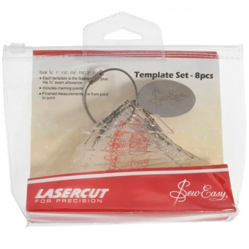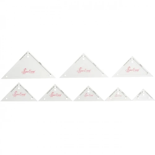 Right angled triangle template set. Great for creating your favorite quilt projects. 8 sizes in set, 3/4in, 1in, 1 1/4in, 1 1/2in, 1 3/4in, 2in, 2 1/2in and 3in. These mini templates sets make cutting a variety of popular sizes of quilting shapes quick and easy. Completely clear and with an in-built 1/4 inch seam allowance, cutting fabric is much easier. A hole at each corner of the templates allows you to mark the seam allowance accurately. Perfect for English paper piecing or machine patchwork