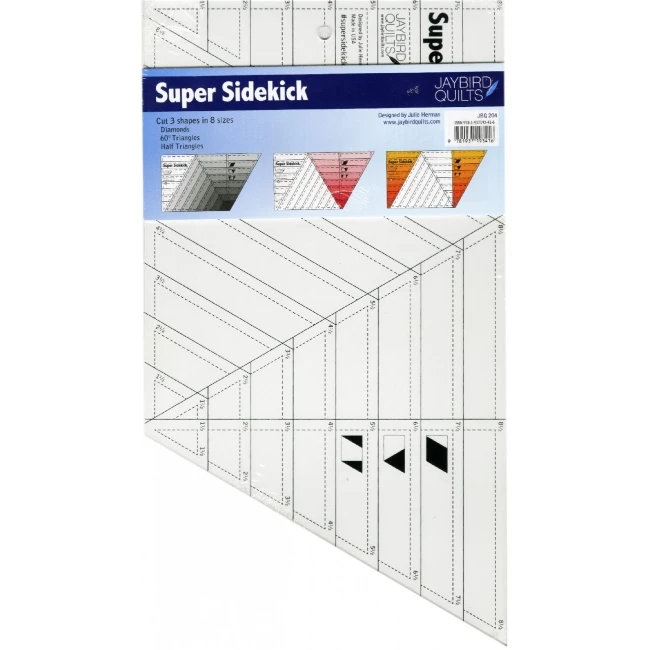 This ruler cuts diamonds, triangles and half triangles. Each ruler comes with full color directions. The Sidekick and Hex N More rulers can work together or alone. The shapes and sizes cut from each ruler can work together to make unique and interesting designs. All of the pieces can be rotary cut from strips