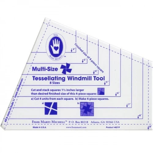 One multi-size acrylic tool with guidelines for cutting 8 sizes of the Windmill shape. Instructions included for cutting pieces so they are automatically on the proper grainline, playing Leap Frog, chain piecing, and making joining rows.