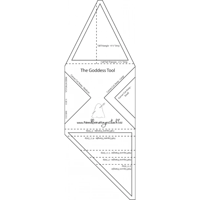 The Goddess Tool From Needle In A Hayes Stack By Tiffany HayesThis tool is designed to quickly and easily create corner cut-aways, half square triangles, tall triangles and half tall triangles. The shapes are used to create Goddess Quilting which is the idea of making motion in quilts with various shaped triangles. Tool only