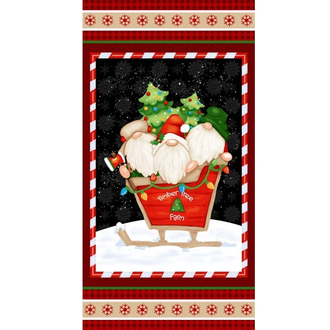 A black and red christmas panel with three santa gnomes on santas sleigh delivering christmas trees